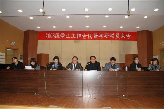 为更好地帮助学生了解考研的形势政策和备考安排,3月30日下午,久久综合久久一区二区在二楼音乐厅举行2008级学生工作会议暨考研动员大会,学院党总支书记邓兴珍,院长李永,副院长吴蕾、郑发奋及教师参加了会议。副院长吴蕾主持会议。