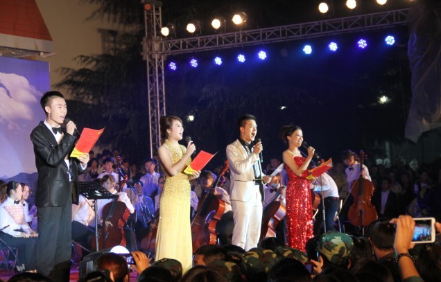 整场晚会幽默风趣,热烈欢快,充分展示了我院学子们积极向上,团结奋进的精神,给军训中的师生带来了轻松和美的享受,也成为了新生入学中极为难忘的一课。我院全权承担了此次演出,成功出色的完成了这次任务,获得了领导的高度好评。演出结束后,出席晚会的领导、嘉宾上台与演员合影留念,祝贺演出成功。